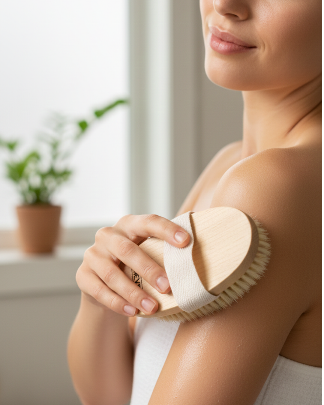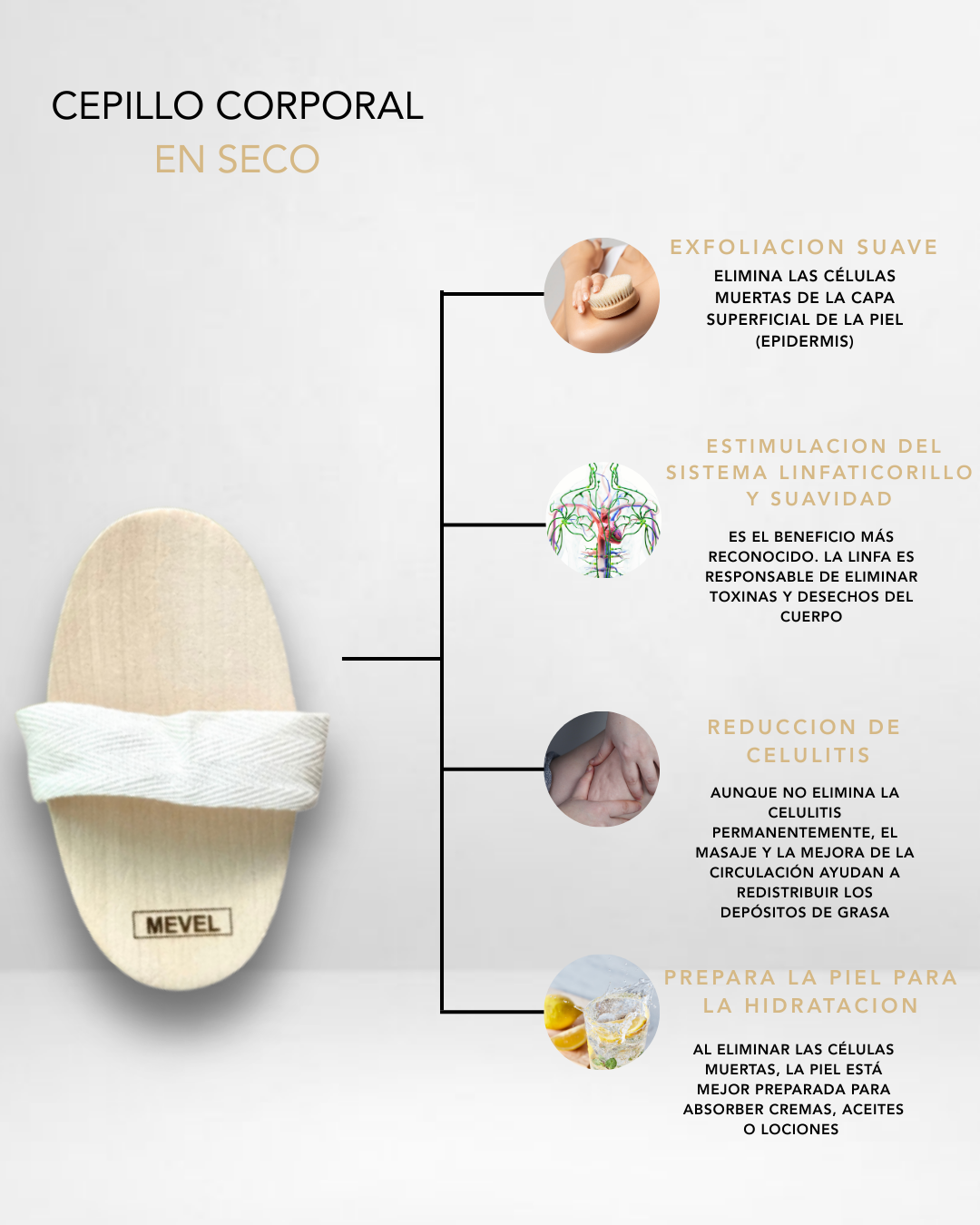 El cepillado en seco exfolia y suaviza la piel, desobstruye los poros, aumenta la circulación sanguínea y estimula el sistema linfático, lo que ayuda a eliminar toxinas y reduce la apariencia de la celulitis. También puede mejorar la absorción de los productos hidratantes, aumentar la luminosidad de la piel y proporcionar un efecto relajante similar a un masaje