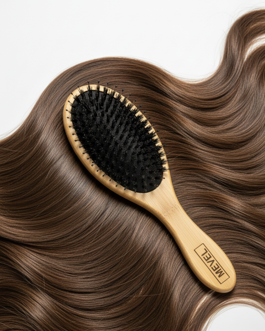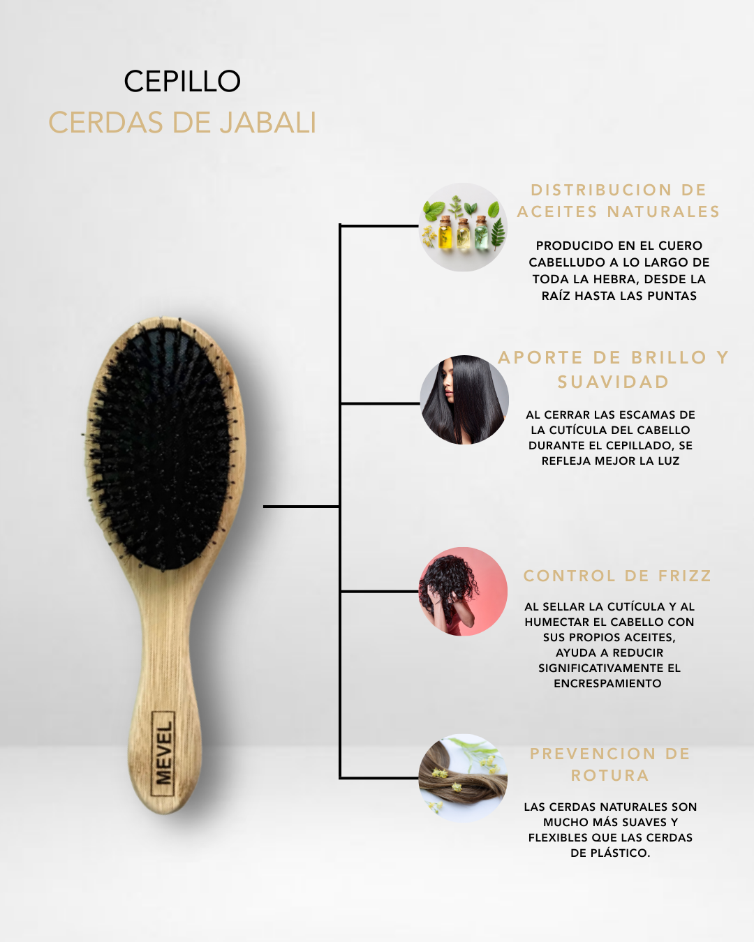 El cepillo de cerdas de jabalí ofrece múltiples beneficios: Ayuda a distribuir el aceite natural del cuero cabelludo para un pelo más brillante y menos graso, desenredan suavemente sin tirones ni puntas abiertas, masajean el cuero cabelludo promoviendo la circulación sanguínea y, por su suavidad, son ideales para cabellos finos, quebradizos y secos.