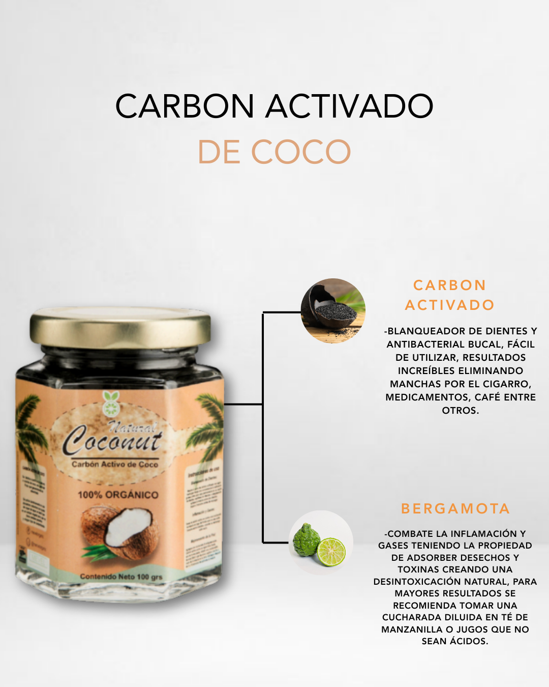 El carbón activado de coco se fabrica a partir de la cascara o concha de coco, una parte del fruto que generalmente es desechada. Se activa térmicamente en una atmosfera reductora con ayuda de vapor en agua logrando obtener un carbón vegetal puro que no contiene metales pesados y ningún tipo de contaminante es totalmente orgánico y elaborado artesanalmente.
